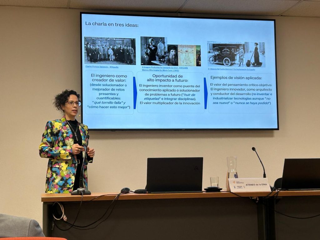 Under the title “Engineering Value in Technological Innovation: Balancing Purpose and Efficiency from Lab to Industry”, Aranda reflected on the role of engineering as a driver of value in times of energy transition, materials demand, and geopolitical challenges. She emphasized how innovation, intellectual-property management, and public-private cooperation are key to transforming scientific knowledge into real industrial impact.
